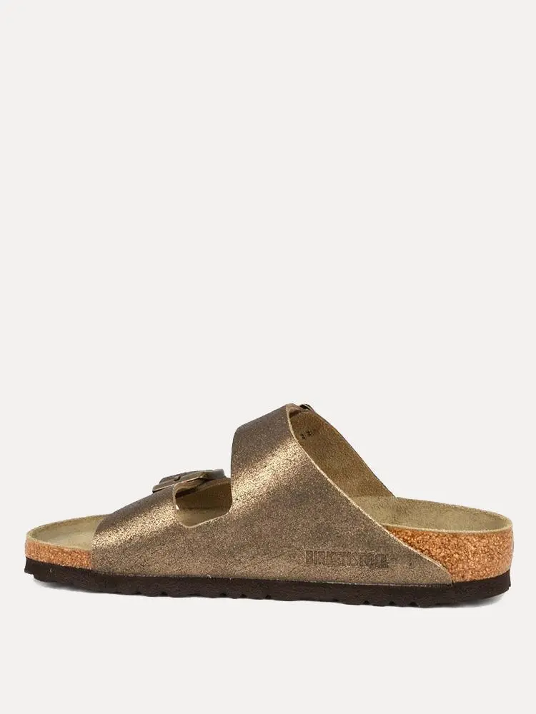 Add a little sparkle to your holiday getaway with the Birkenstock Arizona Washed Metallic Antique Gold Sandal.
