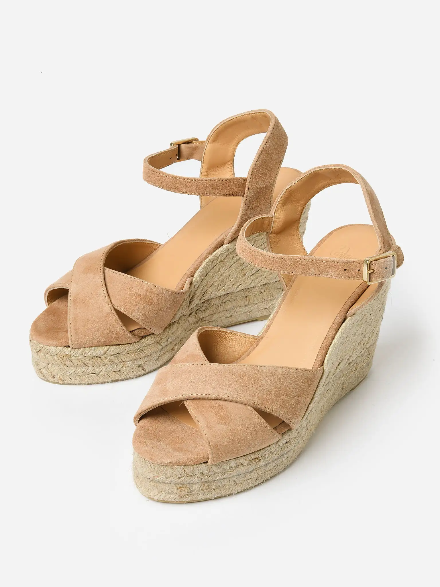 Suede espadrille wedge with criss-cross straps and an adjustable ankle strap.