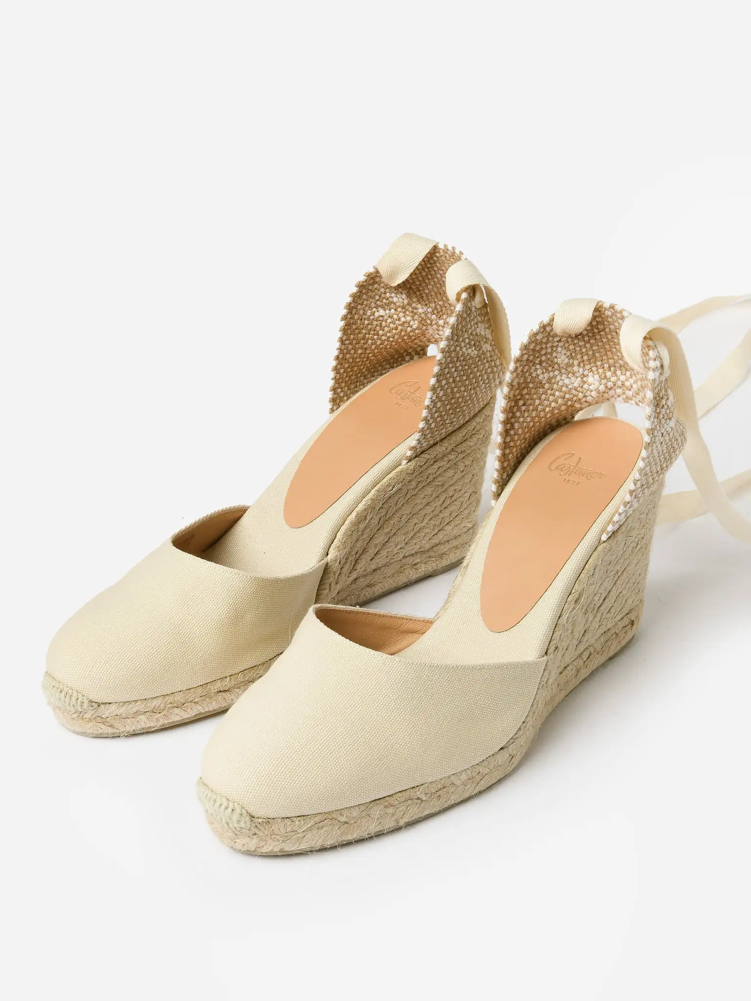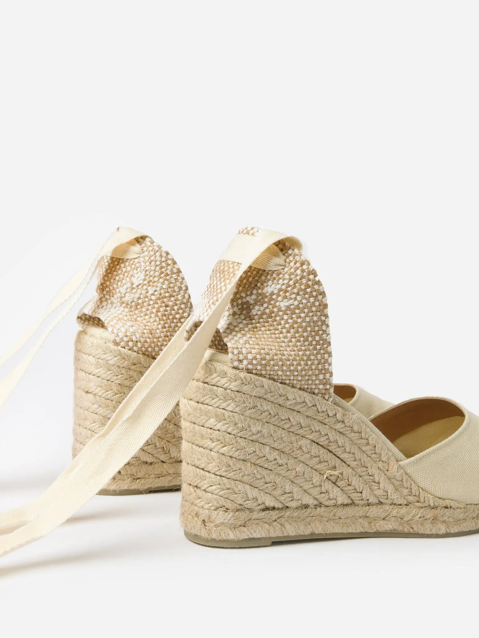 Espadrille-style wedge with a canvas upper and self-tie ankle straps.