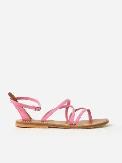 Flat sandal with a strappy silhouette and adjustable ankle strap.