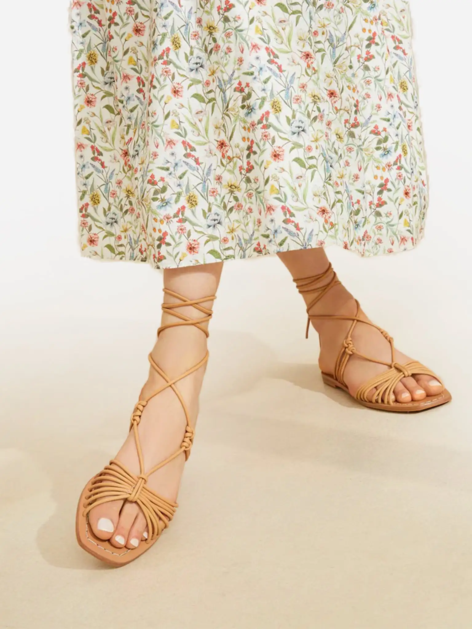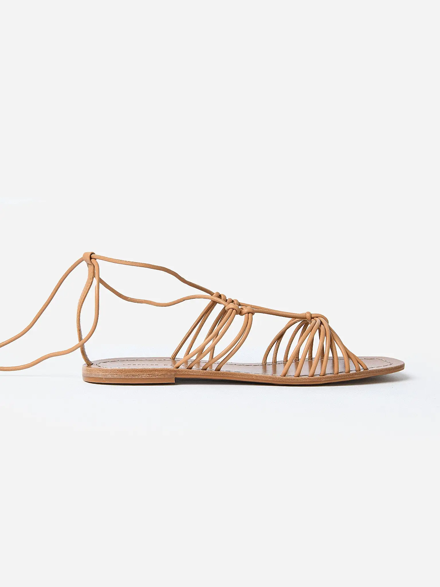 Leather lace-up sandal with a pieced mignon upper and flat sole.