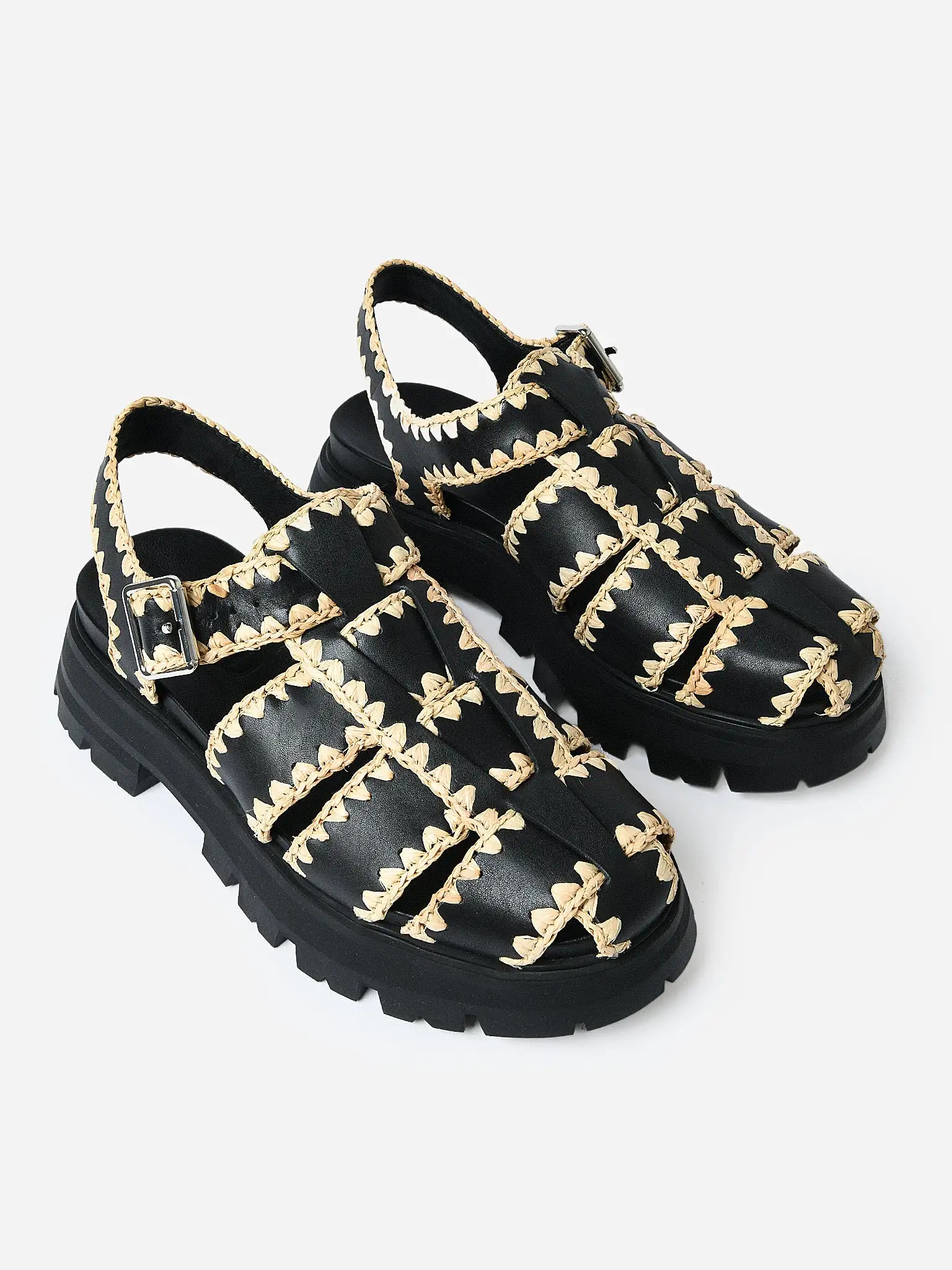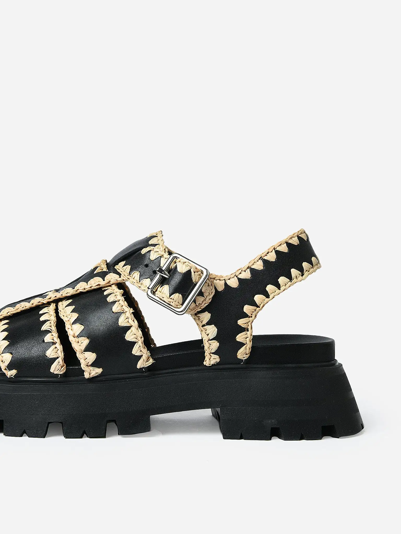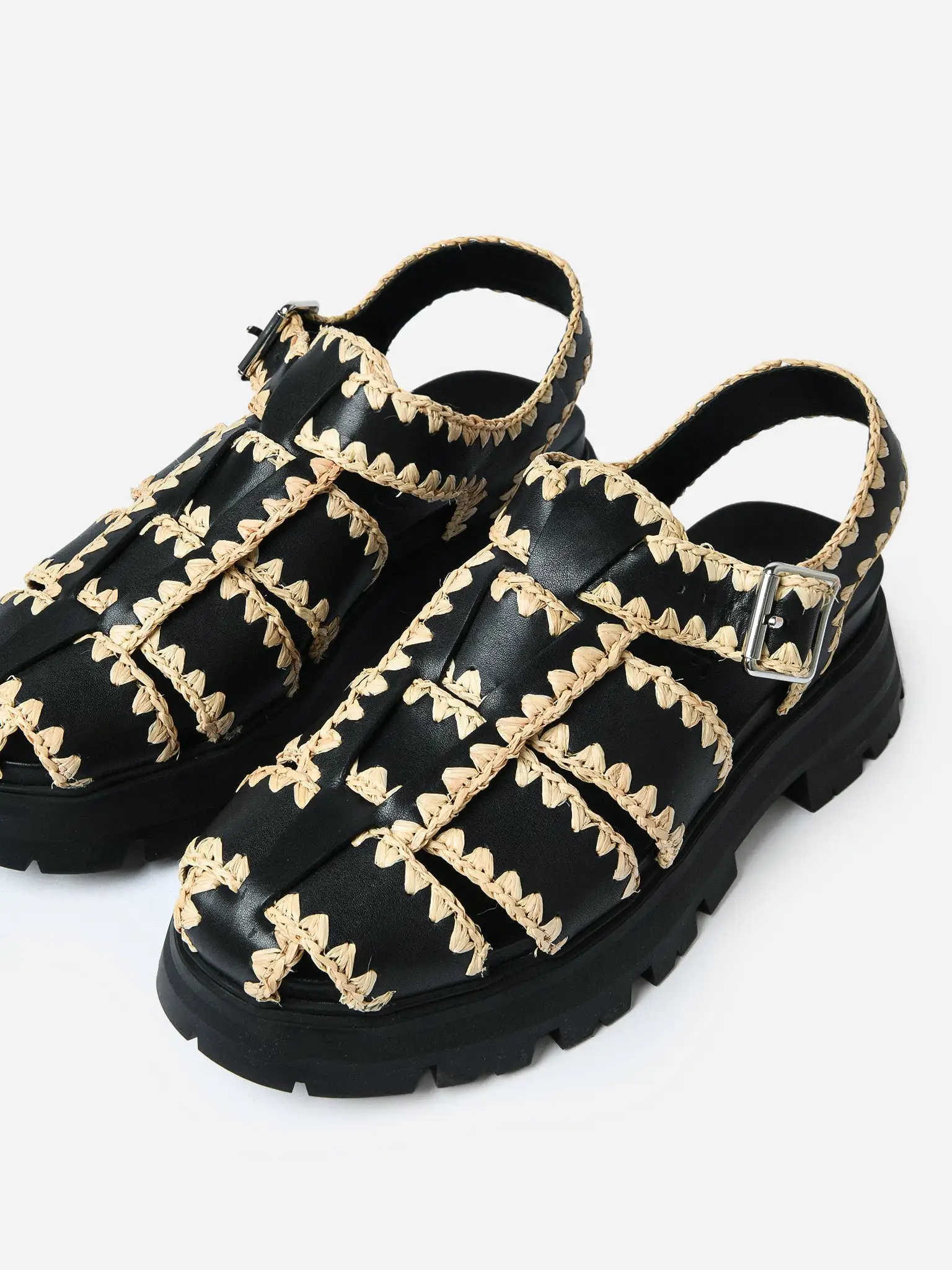 Leather fisherman-style sandal with a platform sole and raffia trim.