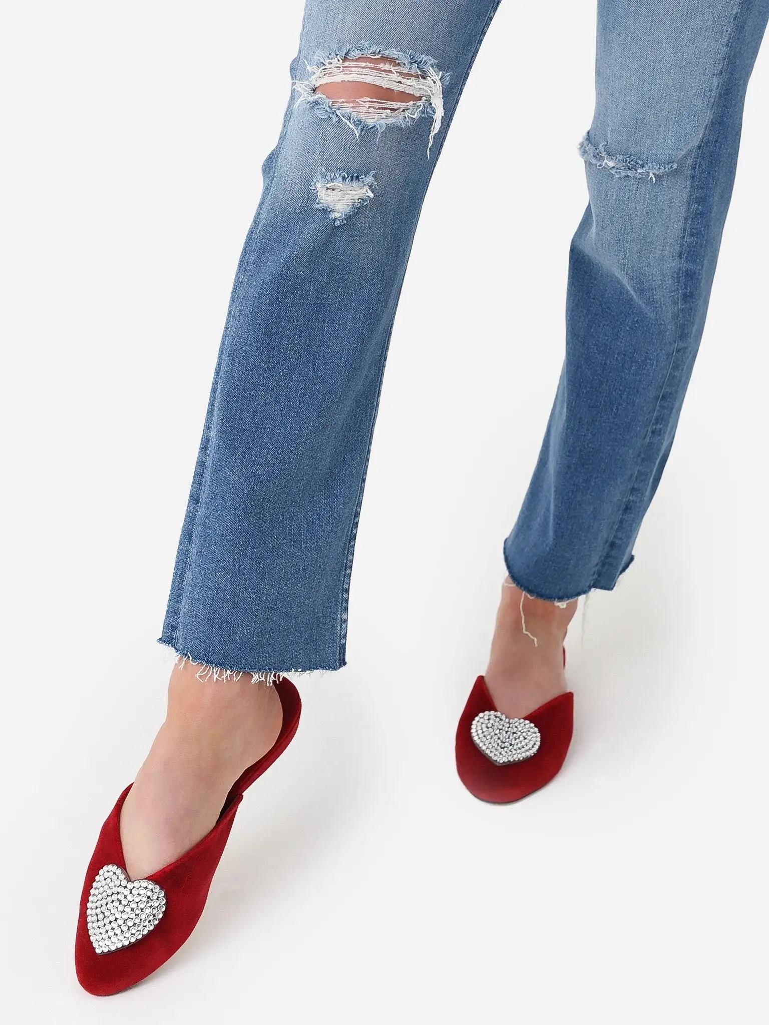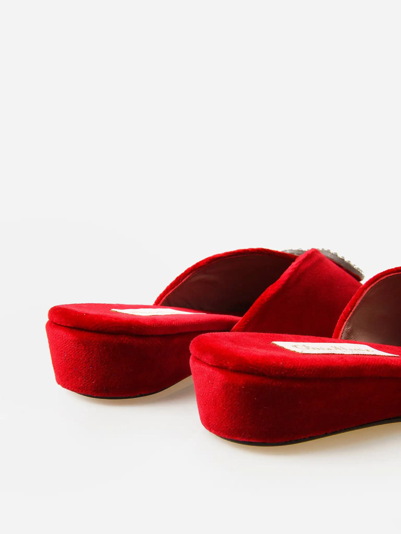 Velvet wedge slipper with a crystal-embellished heart detail and brushed leather sole, also suitable for outdoor wear.