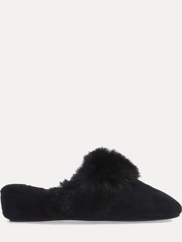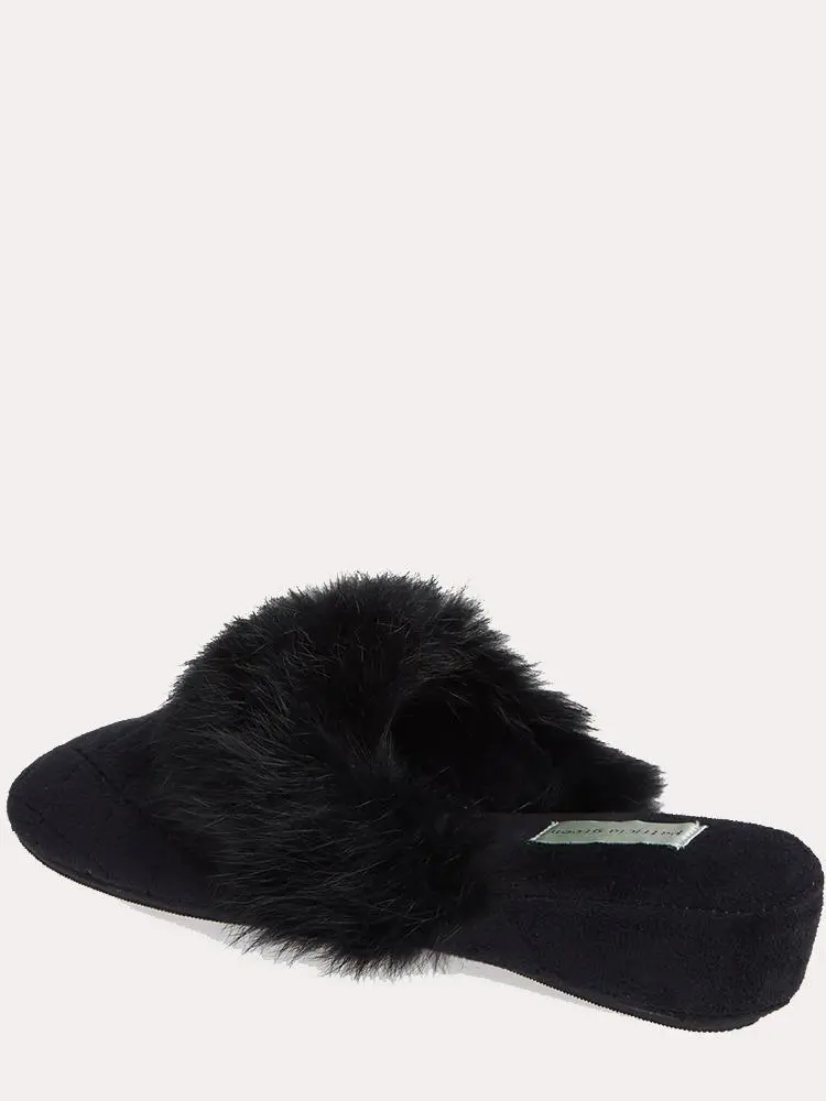 A 1 1/2 inch wedge slide with a cushy footbed and a rabbit fur cuff for a luxurious touch.