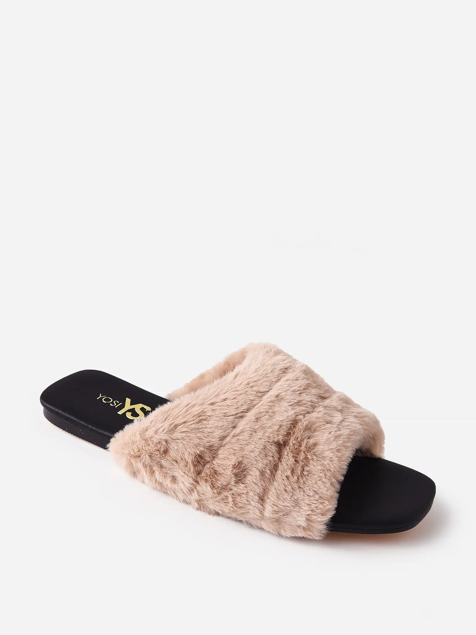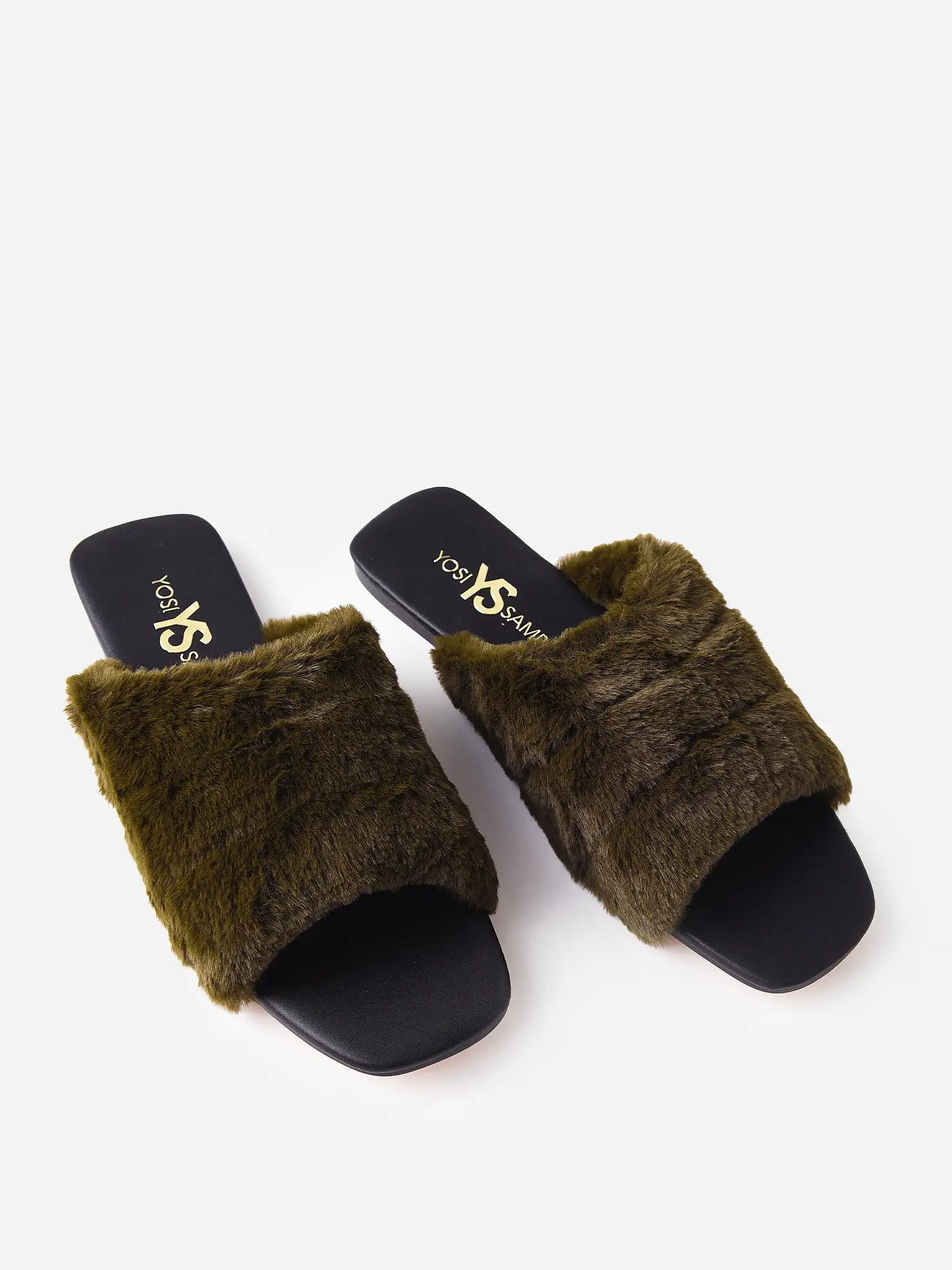 Designed to fit snugly for ease of movement and flop-free steps, the comfy and cozy Yosi Samra Women’s Nora Faux Fur Slide in faux fur ups your indoor-to-outdoor-day-to-evening style game.